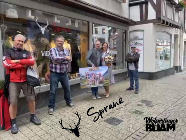 „Wir melden uns wieder live vom Tatort ! In wenigen Sekunden wird die Abordnung der WOLPERTINGER BUAM das große Gruppenfoto der Band an Kasper Osthoff von "Spranz Trachtenmoden" überreichen, welches in Zukunft den Eingangsbereich verzieren wird. Kasper, die WOLPERTINGER BUAM werden ab sofort professionell von "Spranz Trachtenmoden" eingekleidet. Wie kam es denn zu der Kooperation ?“